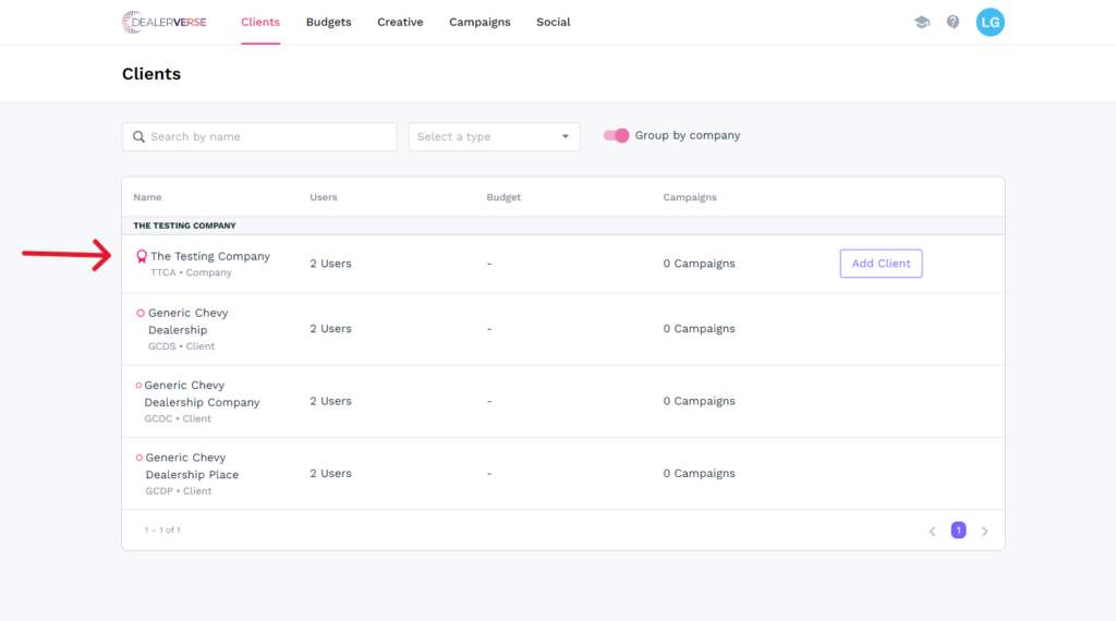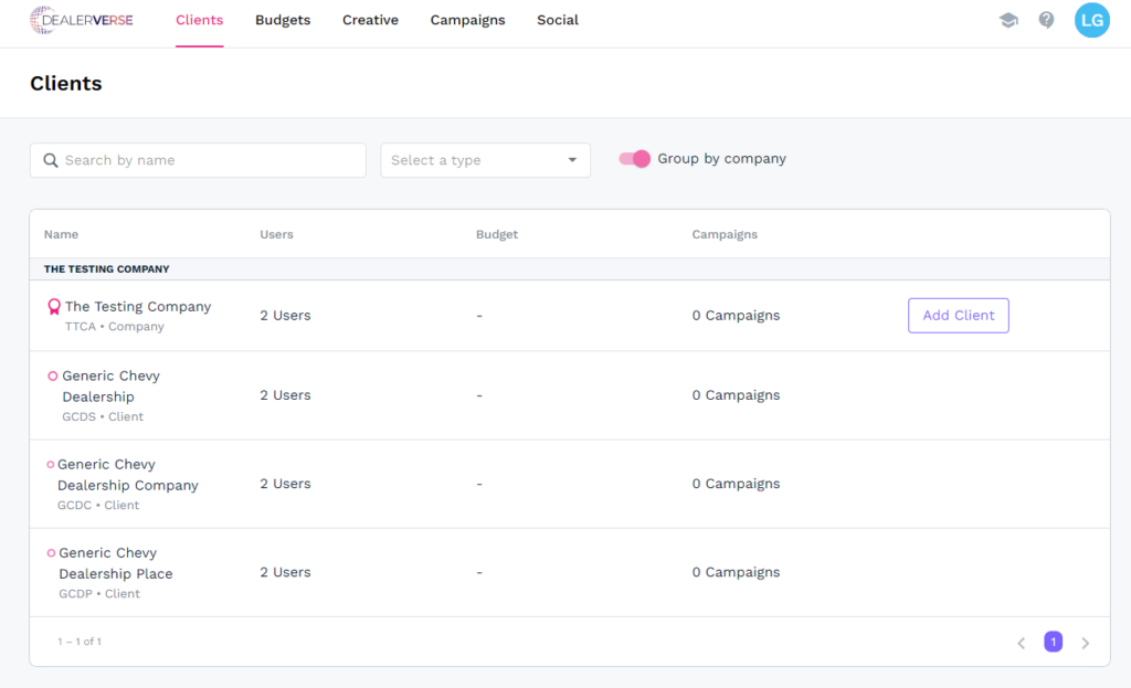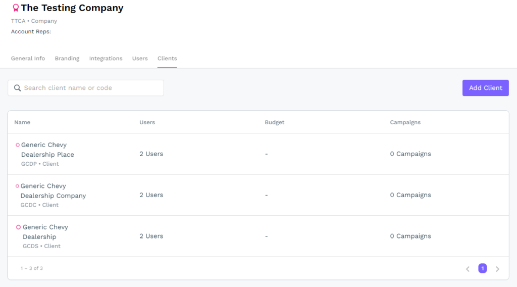 The Clients tab is used to manage any sub-accounts or clients underneath the Company. Again, if the user initially selected a client to view instead of the company, this tab would not be visible. In order to edit an existing client, simply click the client you’d like and it will redirect you to the General Info tab where you can make edits. In order to add a new client, simply click the “Add Client” button and fill out the pop-up form.