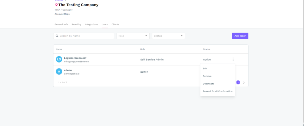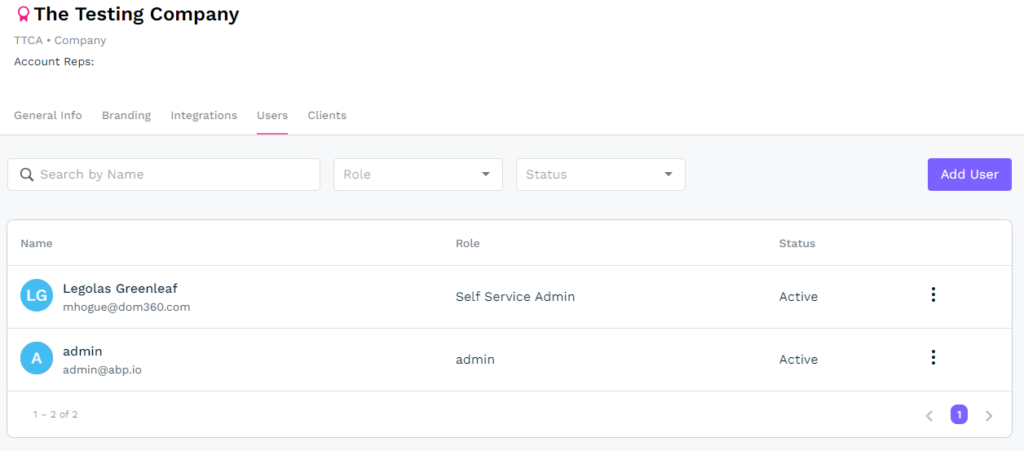 – When a company is selected, the following tabs will be visible depending on user permissions: General Info, Branding, Integrations, Users, & Clients