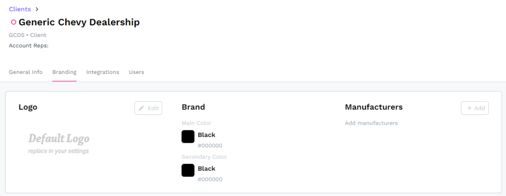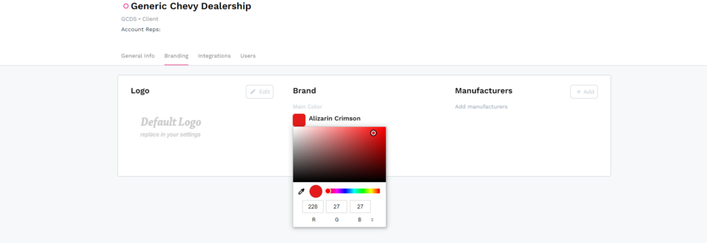 This tab allows users to add a dealership logo, brand colors (in RGB), and add the manufacturers they represent.