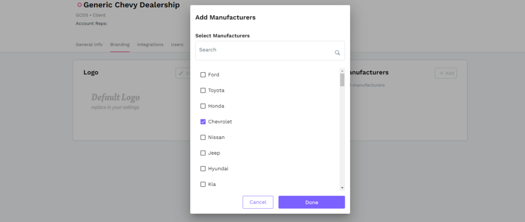 – When you click on the “+ Add” button under “Manufacturers” and a pop-up window will appear. From here, you can select the manufacturers that the dealership sells and then click “Done”.