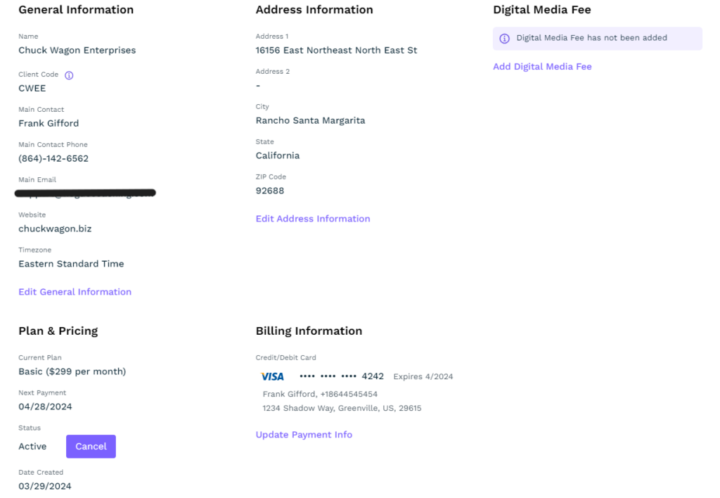 This is where all company or client information is stored, including the business name, client code, contact name and number, contact email, website, and address information. This is also where the plan and pricing are set and where the billing information is stored. To edit any of these sections, simply click on the edit links at the bottom of the sections and a pop-up window will appear where the changes can be implemented. If you want to cancel your DealerVerse account, there is a “Cancel” button under the Plan & Pricing section. If you’d like to change your credit card, you can follow the steps in this FAQ.