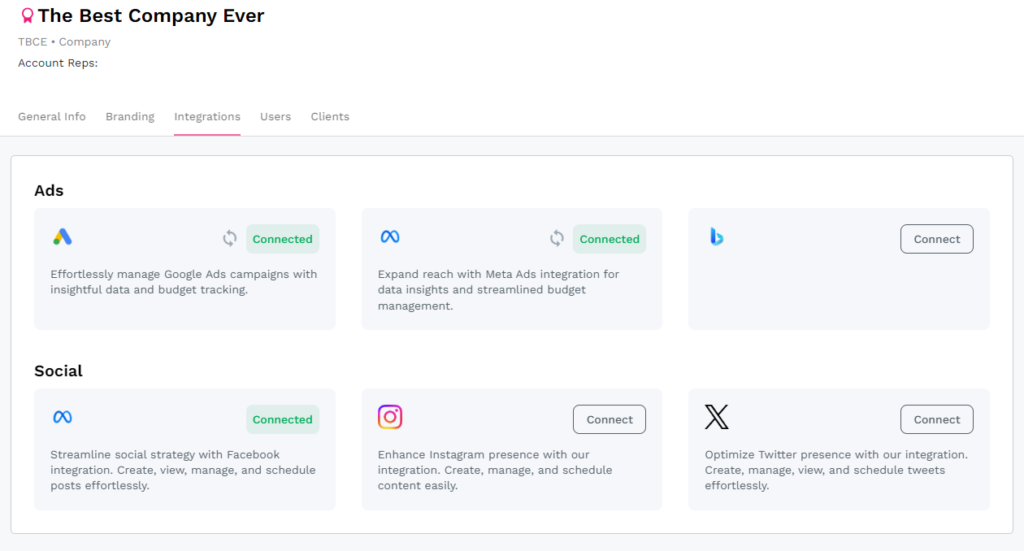 The integrations tab consists of 6 other applications that the company or client can integrate with, 3 for ads accounts and 3 for social media accounts. Paid ads accounts consist of Google ads, Meta ads, and Bing ads. Social media connections consist of Meta (Facebook), Instagram, and X. To integrate your DealerVerse account with one of these accounts, simply click on the associated “Connect” button. A pop-up will appear requesting the username/account id and password for the requested account. Once those credentials have been entered and confirmed, the DealerVerse API should connect to the application API and nothing further should be required.