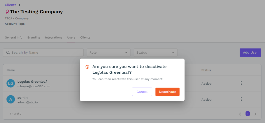 – When a client is selected, the following tabs will be visible depending on user permissions: General Info, Branding, Integrations, & Users