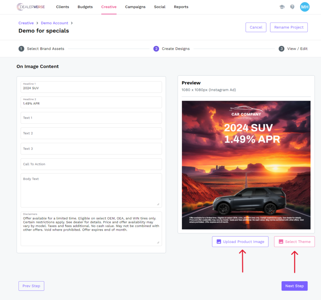You will be redirected to a page where the image content can be added to the template file. Depending on the fields that were selected from, your entries will display on the graphic or not. The theme should be editable by clicking the Select Theme in the bottom right. The vehicle image should be editable by clicking the Upload Product Image button in the lower right. When you are done editing your graphic, click the Next Step button to continue.