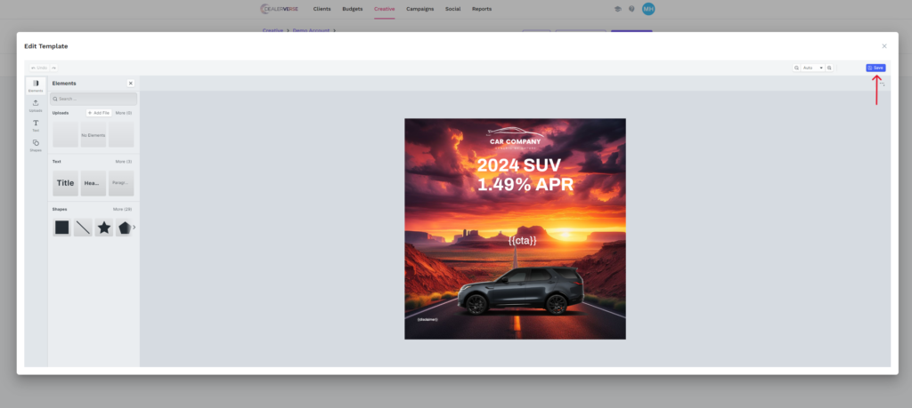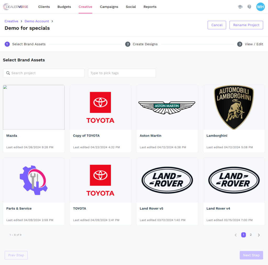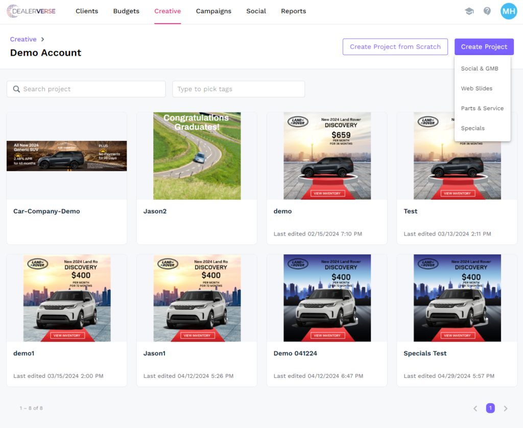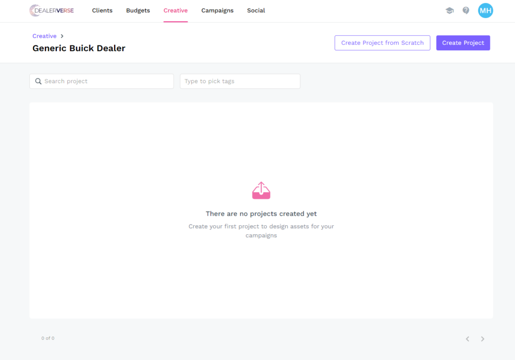 Projects are the step that bridge the gap between a template and a digital asset. Just to review, a system admin or the DealerVerse team will need to set templates up in the system ahead of time so the dealership’s creative team (or an ad agency) can create assets from those templates. Below are the steps to create digital assets from existing templates.