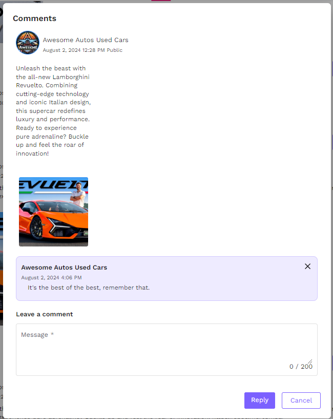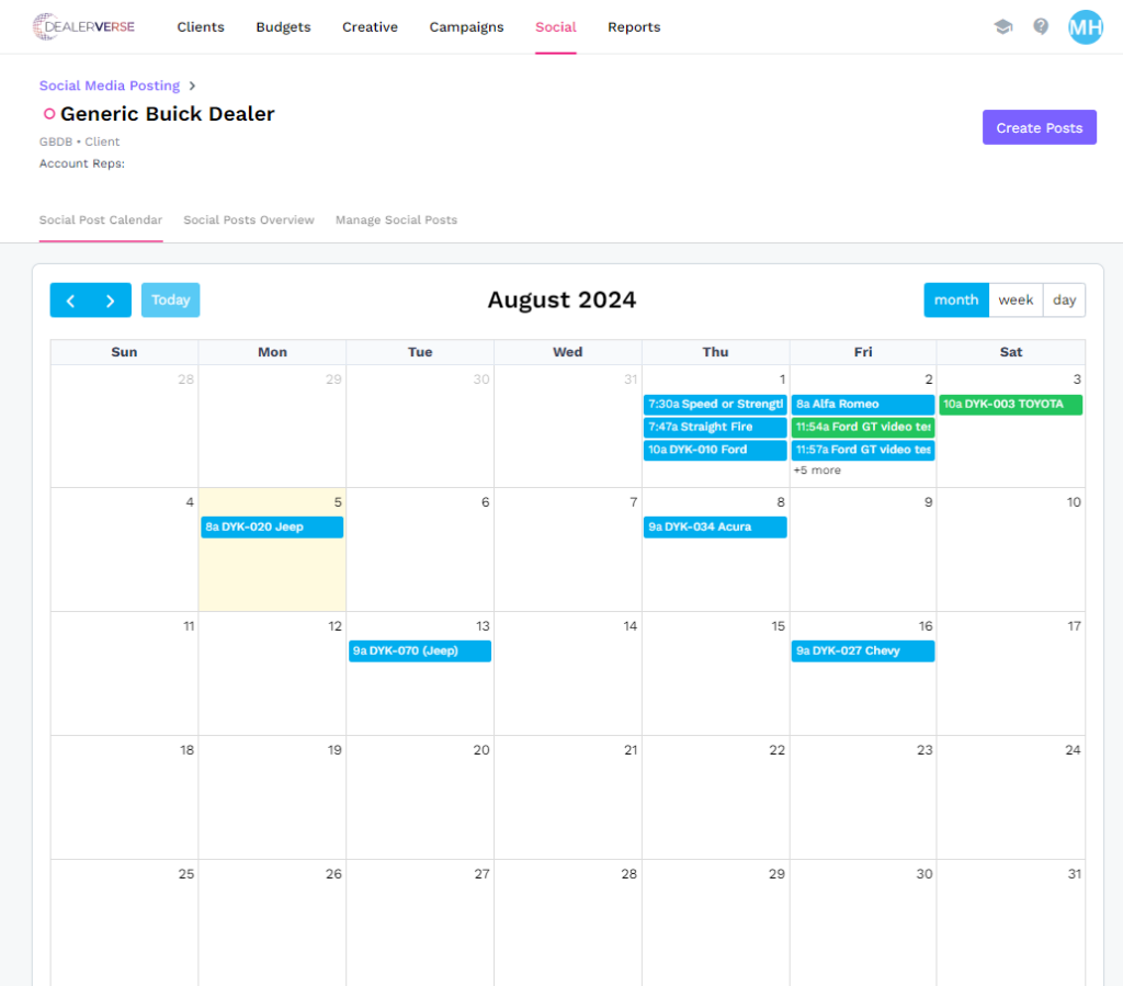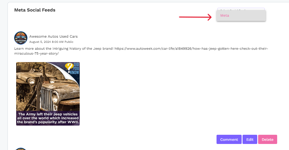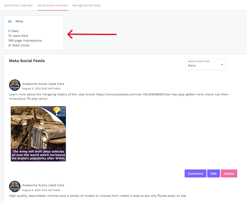 Within the social module is the ability to not only create social posts, but to manage them from DealerVerse without needing to log into your social media platform. This functionality is available to users with the proper roll and permissions. If you are not able to view or interact with this tool, please reach out to your system admin.