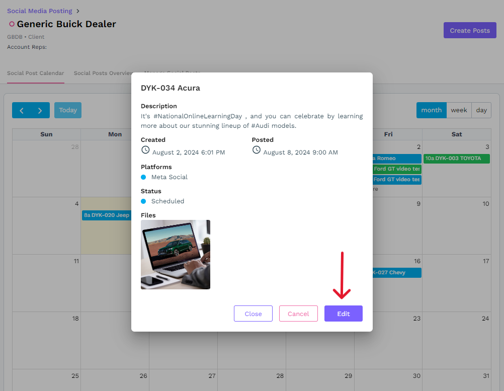 Within the Social Post Calendar, you are able to click on a post to see the details and edit it as long as it hasn’t posted yet, but after it has been posted, you will need to access it from the Social Posts Overview.