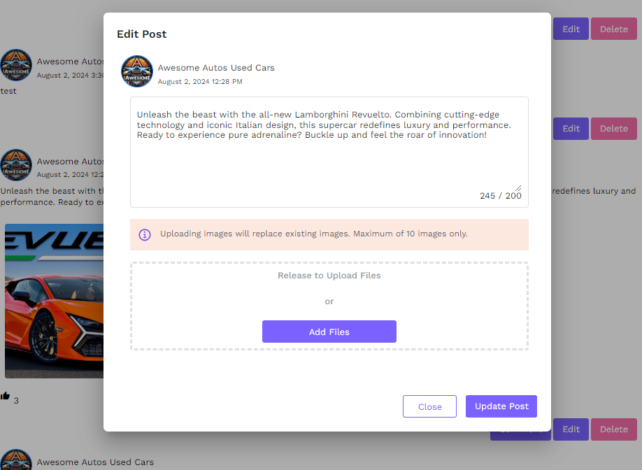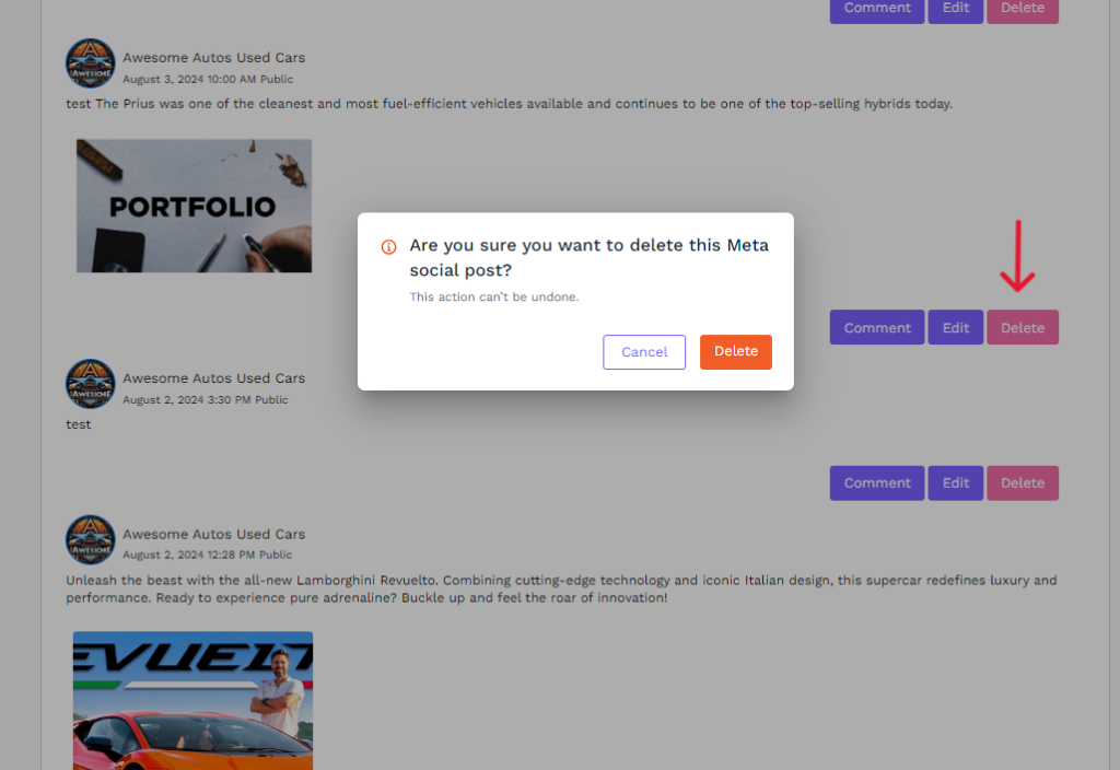 Finally, you will have the option to Delete the post from DealerVerse so you don’t have to log in to the social platform. Once you click the Delete button, you will be asked to confirm so that no accidental deletions occur.