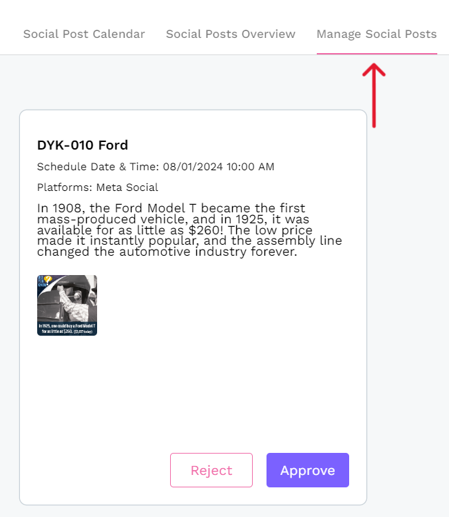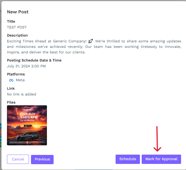 The DealerVerse application has built-in capability to send social media posts to be approved by a social media approver, should it be necessary. To start the process of approval, create a new post or pull something from the social bank that was set up for you. For a full explanation of creating posts, refer to this article.