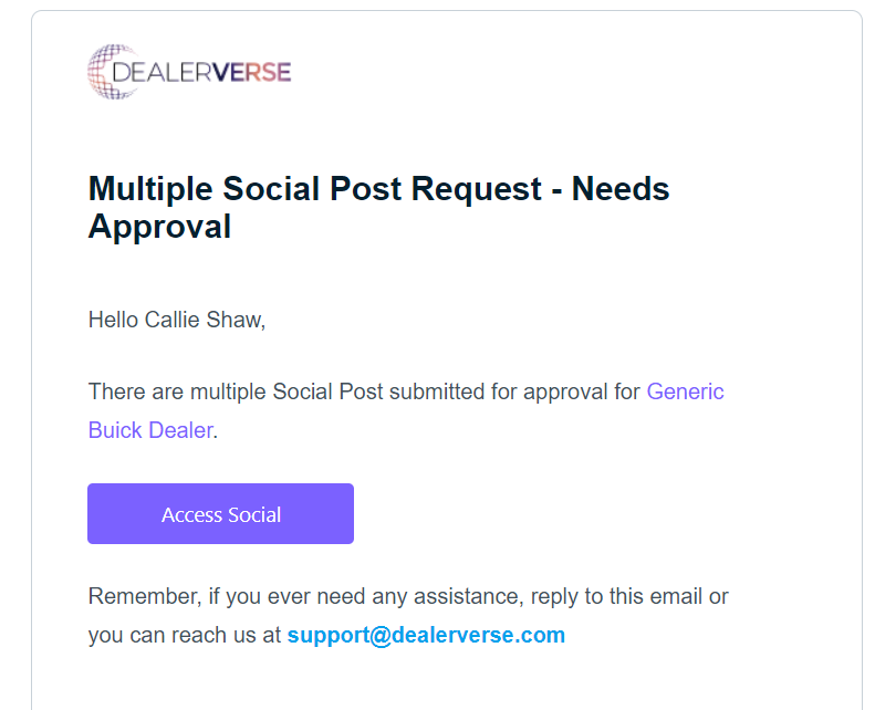 An email would then be sent to the user with the role Social Approver in the system, notifying them that social posts need to be reviewed and approved. The Social Approver would click the button in the email to be taken to DealerVerse where they would be given a visual of the different social posts requiring approval.