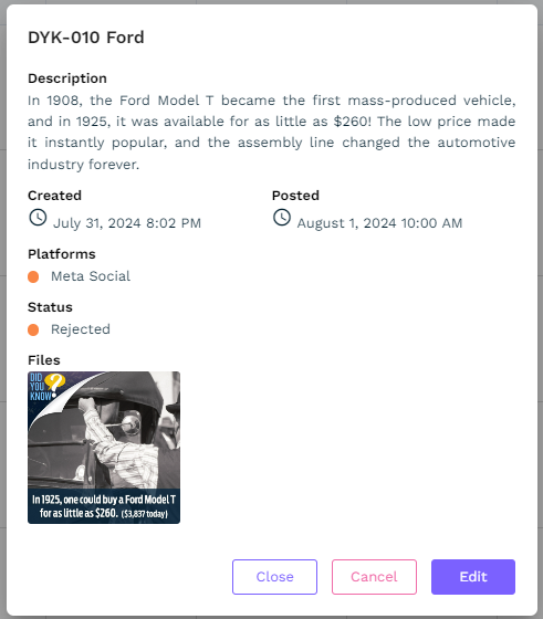 A rejected post would be sent back to the social post creator to resolve any issues the approver saw. In the social calendar, the post would appear as an orange color, denoting that it needs to be revised. Clicking on the social post will open the details modal which will allow the user to now Edit the post or Cancel it.